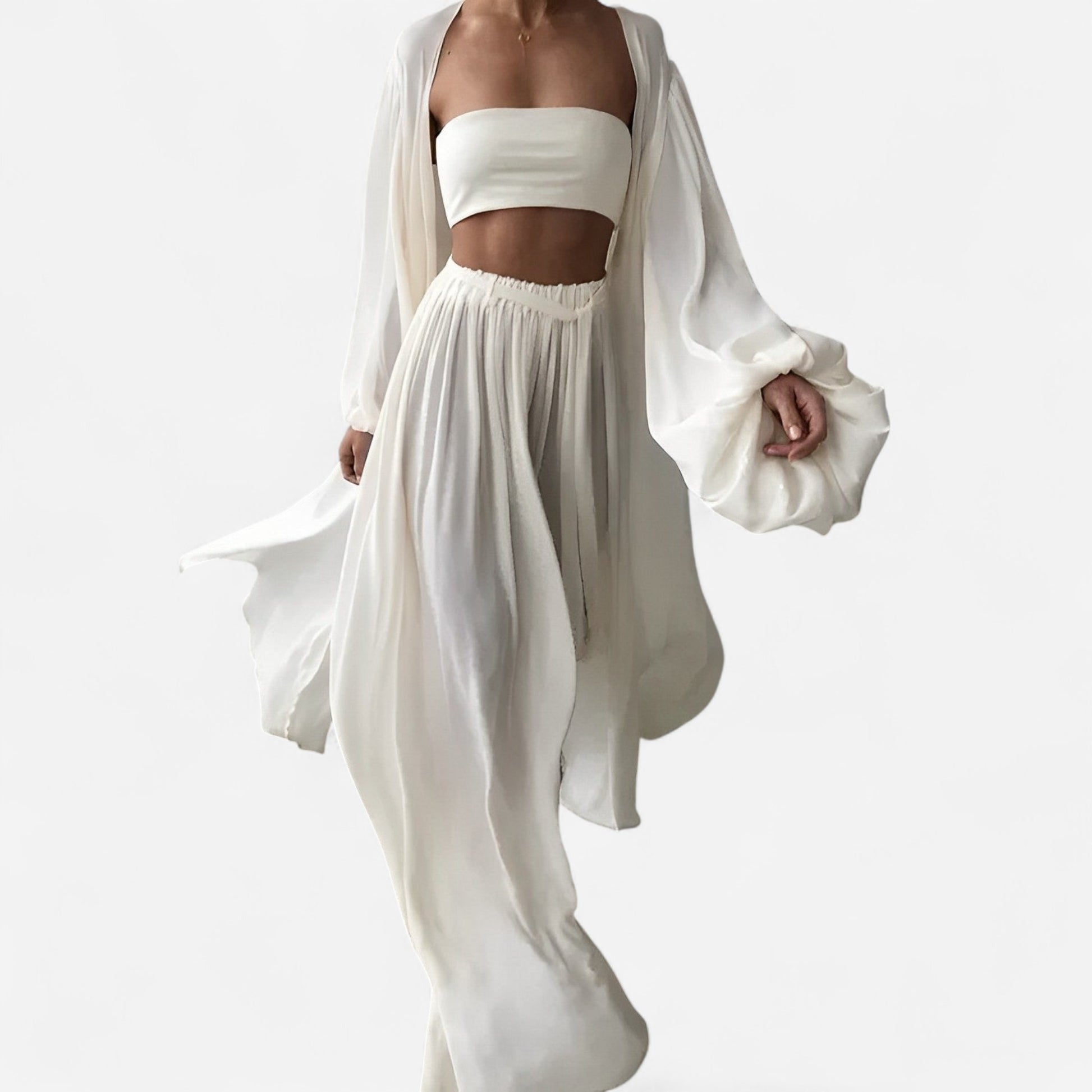Ensemble Élégant en Trois Pièces - Top Bandeau, Pantalons Amples et Duster Aéré