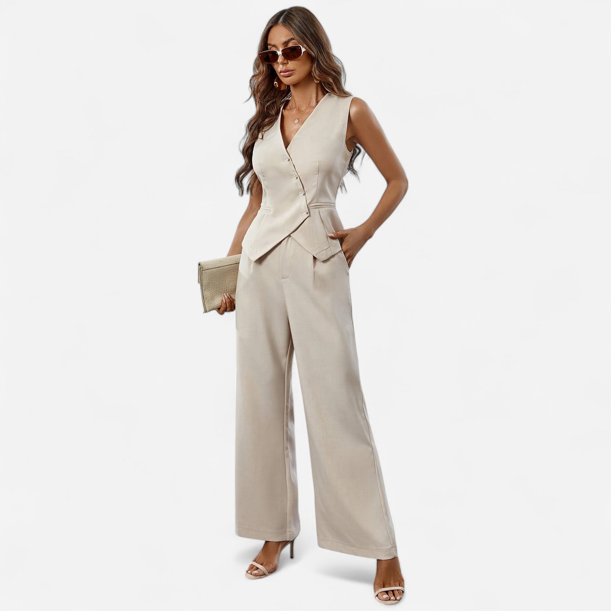 Découvrez notre ensemble chic en deux pièces, conçu pour les femmes modernes qui recherchent une allure sophistiquée sans compromettre le confort. Avec son gilet asymétrique à boutons et ses pantalons à jambes larges, cet ensemble est parfait pour les événements formels, les réunions professionnelles ou les soirées élégantes. Sa matière légère assure un confort optimal tout en vous permettant de rester à la pointe de la mode.