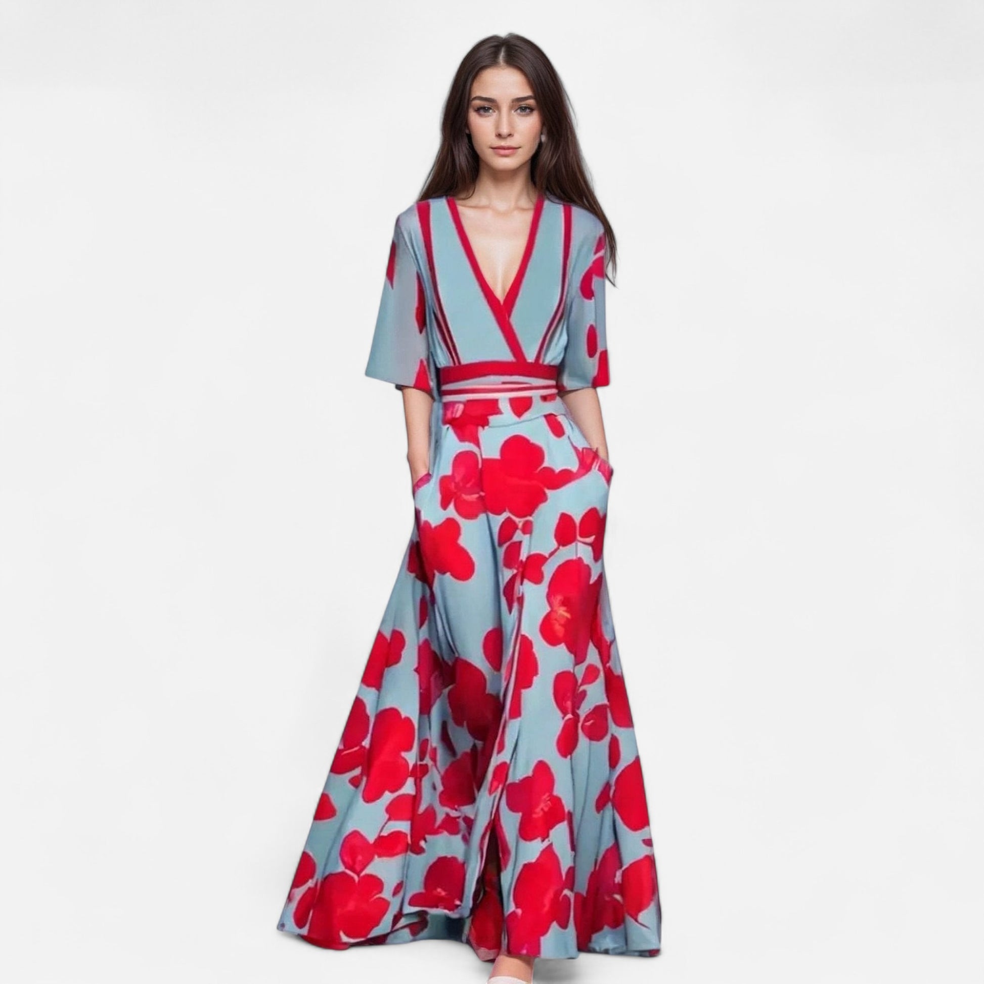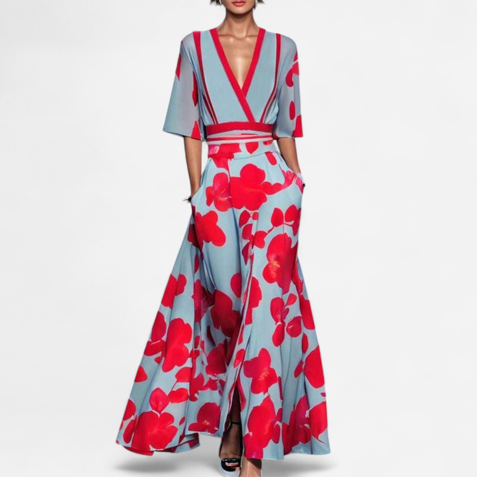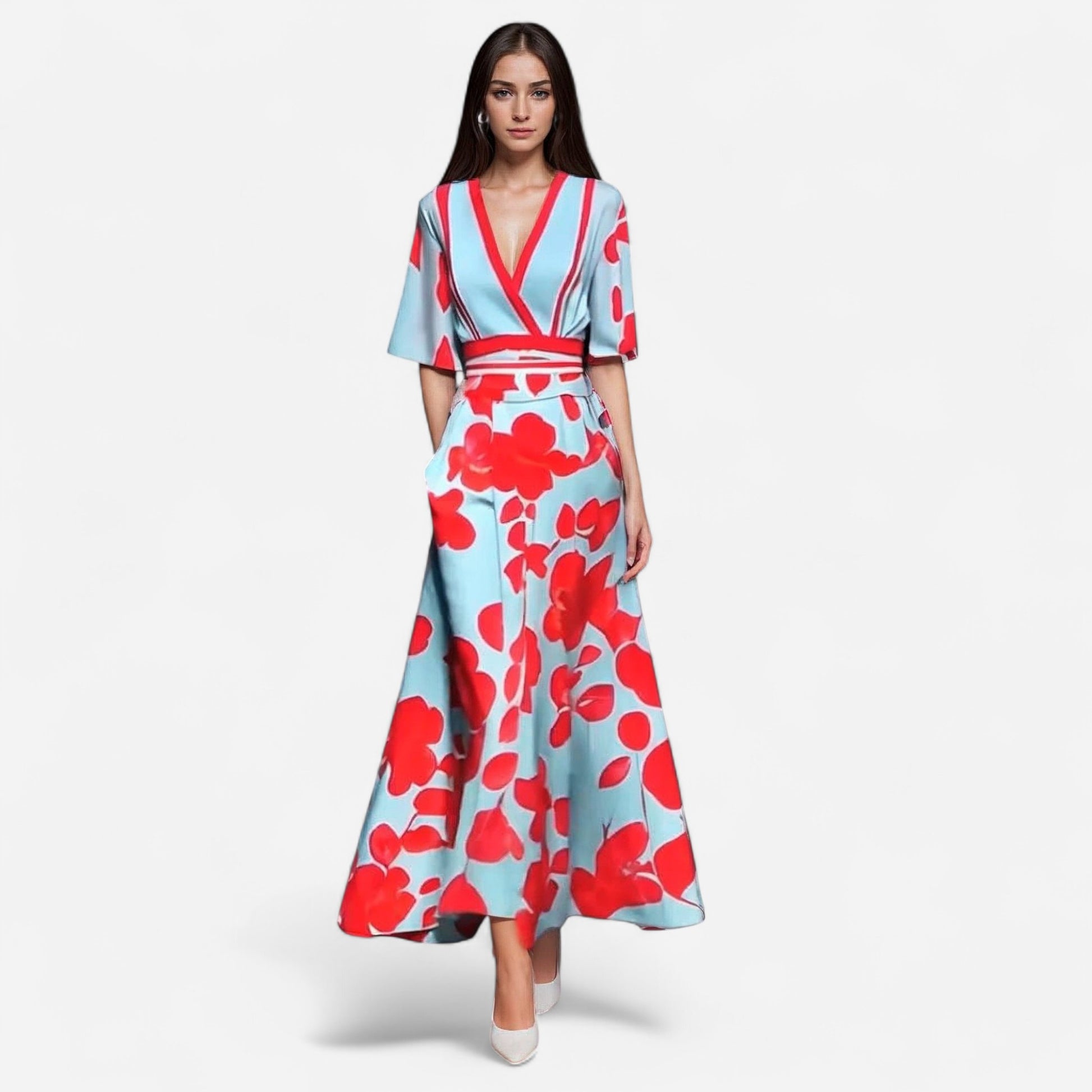 Robe Maxi Fleurie Élégante avec Imprimé Rouge et Bleu
